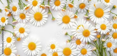 Overhead shot of numerous daisies and chamomiles forming a floral summer background on white, copy space, photography
