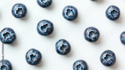 Overhead shot of plump, juicy blueberries arranged on a clean white background, perfect for promoting healthy eating, snacks, or superfoods