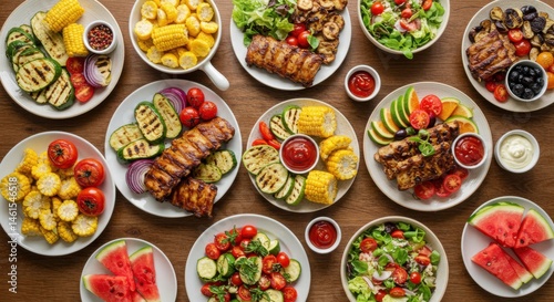 Overhead shot of various plates of ribs corn zucchini salad and watermelon on a wooden table top