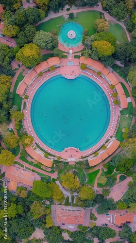 Overhead view of a circular pool surrounded by buildings and lush greenery
