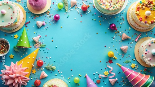 Overhead view of a festive birthday party frame with cakes, party hats, and confetti on a blue background with copy space