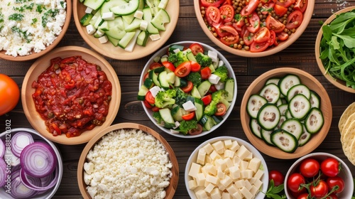 Overhead view of a gluten-free pizza bar with various toppings like fresh vegetables, cheeses, and gluten-free crusts