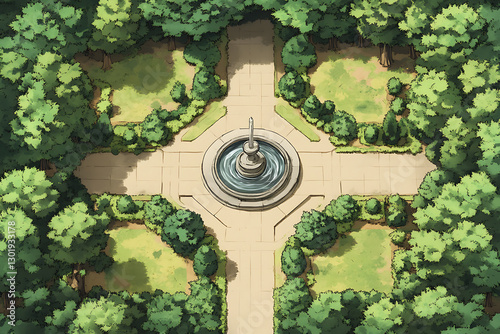 Overhead View of a Serene Park with Central Fountain and Lush Greenery Featuring a Grid of Pathways