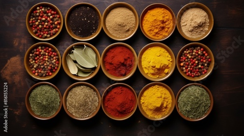Overhead view of a variety of spices in terracotta pots spread on a rich wooden table, giving an authentic and traditional feel