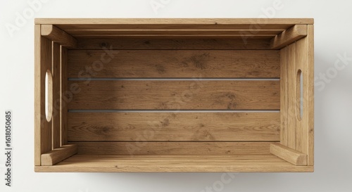 Overhead view of an empty, light brown, wooden crate with slatted bottom on a plain white backdrop