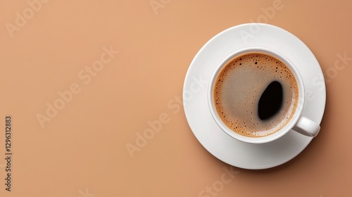 Overhead View of Black Coffee in White Cup on Light Brown Background