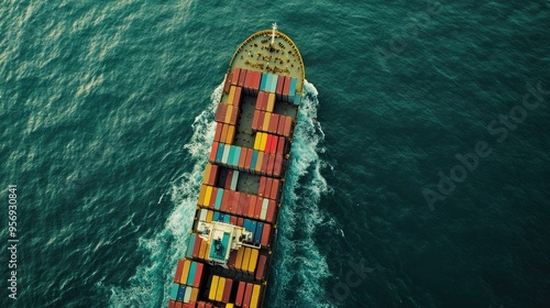 Overhead view of cargo containers on a ship in the open sea, representing global business services and international transportation for the Asia-Pacific region.