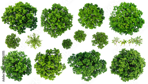 Overhead view of diverse green trees, showcasing variety in size and foliage