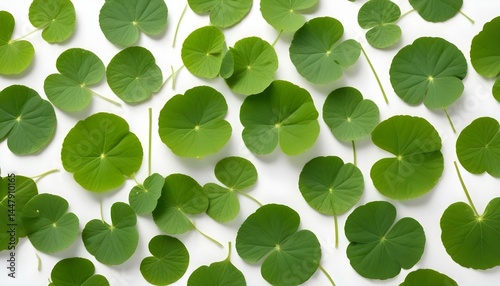 Overhead view of green nasturtium leaves arranged on a clean white background.