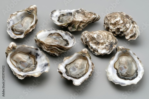 Overhead view of open oysters on a gray surface Gourmet seafood for a French dinner Vertical flat lay