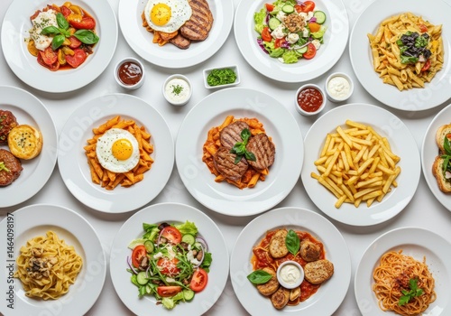 Overhead view of various plated dishes including pasta, salad, steak, and fried eggs on a white surface