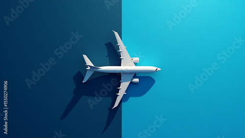 Overhead View: White Airplane on Teal and Blue Background; Minimalist Travel Concept