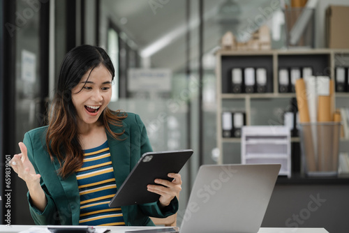 Overjoyed charming excited asian business woman worker using Tablet and laptop working in office, feeling happy.