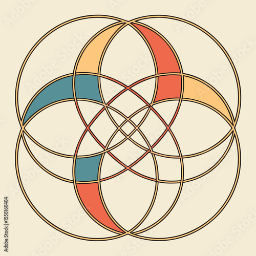 Overlapping circles creating a geometric pattern with filled segments in different colors on beige background