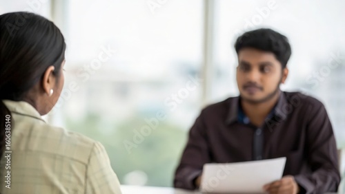 Over-Shoulder Blurred Shot of Indian Interviewer Facing Candidate