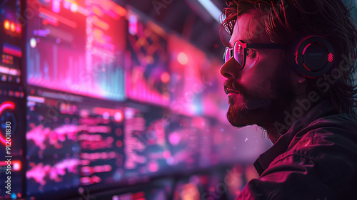 overview an engineer's shoulder. On the monitor are multiple screens of dev code, team share online collaboration.generative ai