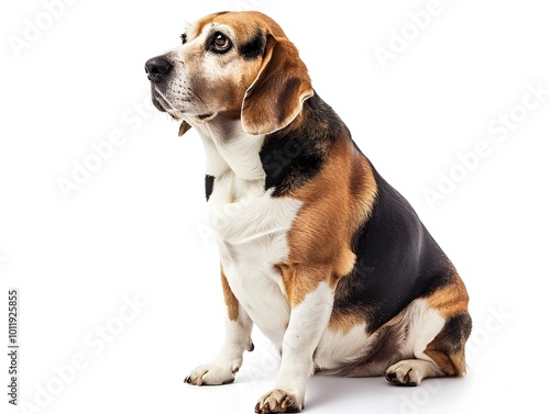 Overweight Beagle Dog Sitting with Tilted Head and Floppy Ears on White Isolated Background
