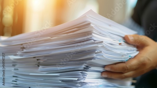 overwhelmed with work - person holding stack of papers, business and office concept.
