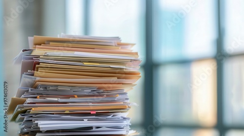 Overwhelmed Workspace, stacks of disorganized documents, soft focus on busy office background, reflecting the chaos of daily tasks and responsibilities.