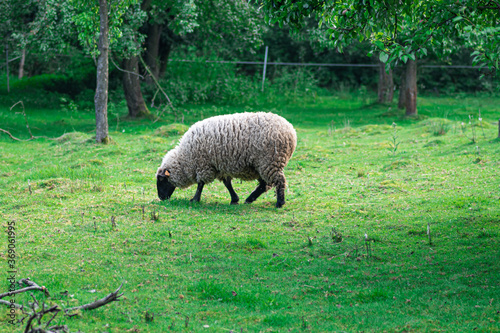 owca czarnogłowa pasie się na łące