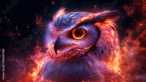 owl, the head of an owl in a multi-colored flame. Abstract multicolored profile portrait of an owl head on a black background