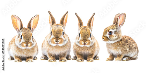 Pack Collection Four Brown Rabbits CloseUp Animal Photography set against transparent background