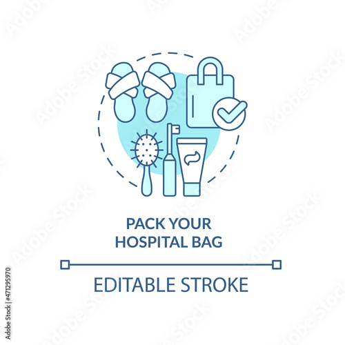 Pack hospital bag blue concept icon. Preparing for baby abstract idea thin line illustration. Choosing clothes and accessories. Clinic admission. Vector isolated outline color drawing. Editable stroke