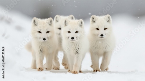 Pack of Five Adorable White Siberian Huskies Puppies Running Through Snow in Cold Winter Landscape with Snowflakes Falling and Blurred Background