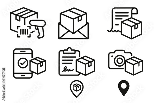 Package tracking and delivery icons set: barcode, smartphone, camera