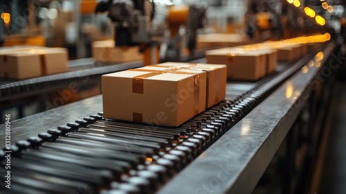 Packages moving on a conveyor belt in a busy warehouse, showcasing automation and logistics