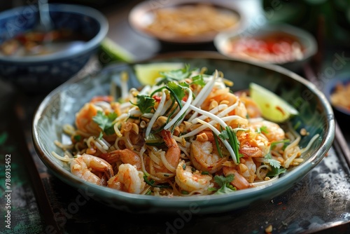 Pad thai noodles, Thai street food, Pad thai on rustic wood table, Generative AI