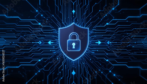 Padlock Icon Inside Shield with Blue Lines and Circuit Background for Cybersecurity