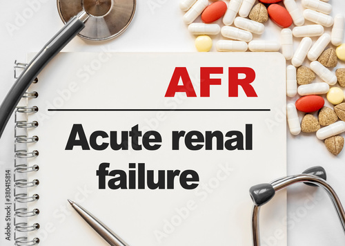 Page in notebook with AFR Acute renal failure on white background with stethoscope and group of pill. Medical concept. Term and abbreviation