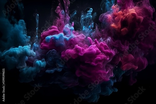 Paint water. Mist cloud. Fluid splash. Storm wave. amazing colors glowing glitter haze floating on dark black abstract art background.