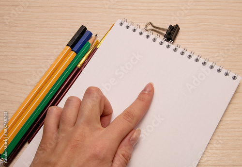 Painting brushes, pencil, pens, paper clip, female left hand finger pointing at white blank notebook on wooden background