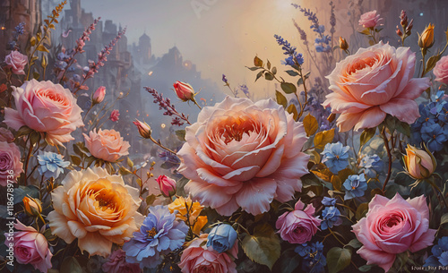 Painting of a field of flowers with a pink rose in the foreground. The painting is full of color and has a bright, sunny feel