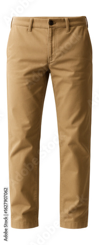 Pair of beige tailored trousers with belt loops, a button, and zip closure on transparent background.