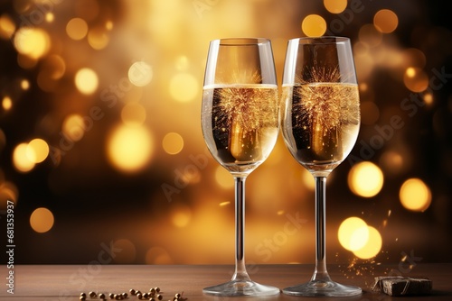 pair of champagne glasses with bokeh lights for celebration of happy new year eve party