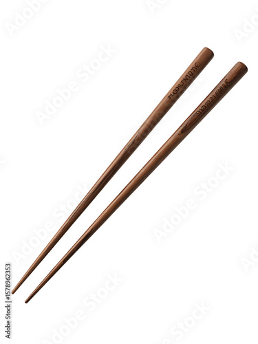 Pair of elegant dark wooden chopsticks with engraved text on white background