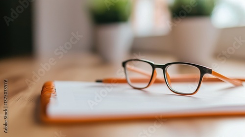 Pair of glasses resting on top of an open notebook. the notebook is orange in color and has a spiral binding. the glasses have black frames and orange temples.