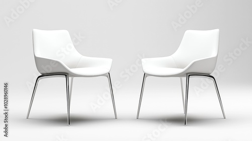Pair of modern white chairs with metal legs facing each other on a plain background