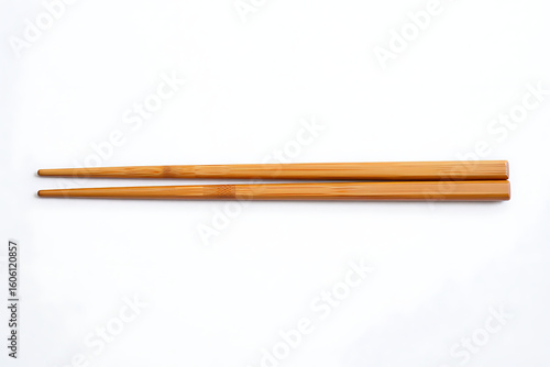 Pair of natural bamboo chopsticks resting horizontally on a clean white background top down view