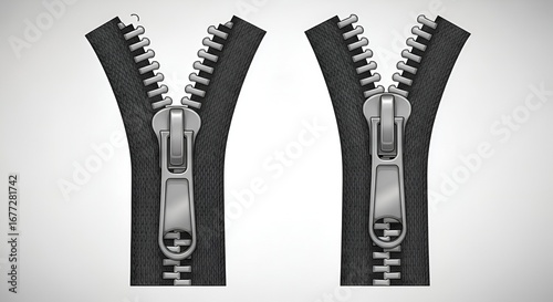 "Pair of Open Black Zippers on Gray Background, Ideal for Fashion and Design Concepts."
