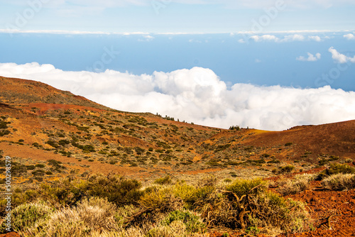 Paisaje con vegetación y nubes en el Parque Nacional del Teide, isla de Tenerife.