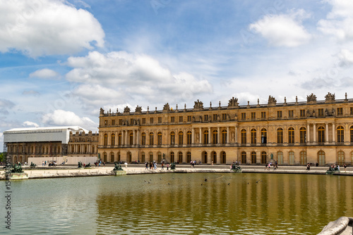 Palace of Versailles Facade with Lake and Cloudy Sky
