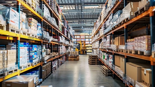 Pallets stacked high, forklifts maneuvering through aisles, and cartons ready for distribution in a high-resolution image.