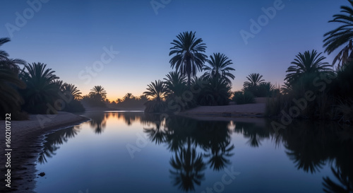 Palm tree oasis reflected in still water surrounded by golden desert sand. Desert water source and tropical vegetation contrast. Environmental diversity study