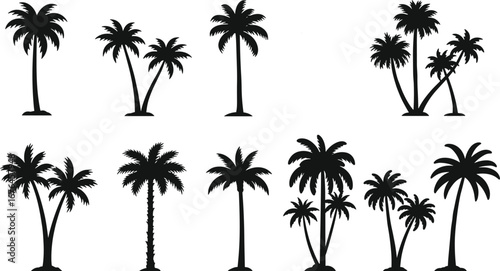 Palm tree silhouette collection, tropical nature design, beach tree vector, summer holiday illustration, exotic island symbol, outdoor eco artwork, travel background