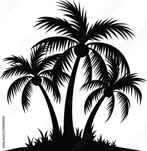 Palm Tree Silhouette on Island Vector Illustration, black and white silhouette vector. Tropical palm tree, Simple black silhouette of three palm trees on a white background.