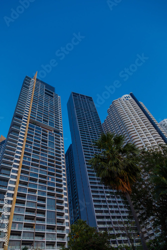 Palm tree tops against apartment or hotel building and blue sky. Vacation tropical background.